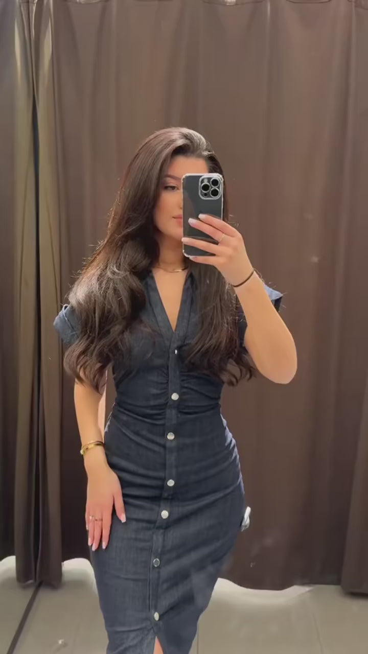 El detalle ruched (drapeado) añade un toque de feminidad y modernidad al look, creando una caída elegante que realza las curvas de forma natural, sin marcar ni apretar. Las mangas cortas hacen que el vestido sea ideal para los días más calurosos, garantizando frescura y libertad de movimiento.